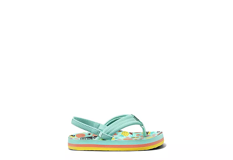 So cute, you may never want to take them off: Little Ahi flip flop sandal by REEF. With a synthetic upper featuring a webbing lining for a soft feel, this slingback strap sandal securely holds your baby’s foot. The printed footbed offers a colorful pop with the comfort to match while the EVA outsole keeps up with every move.
